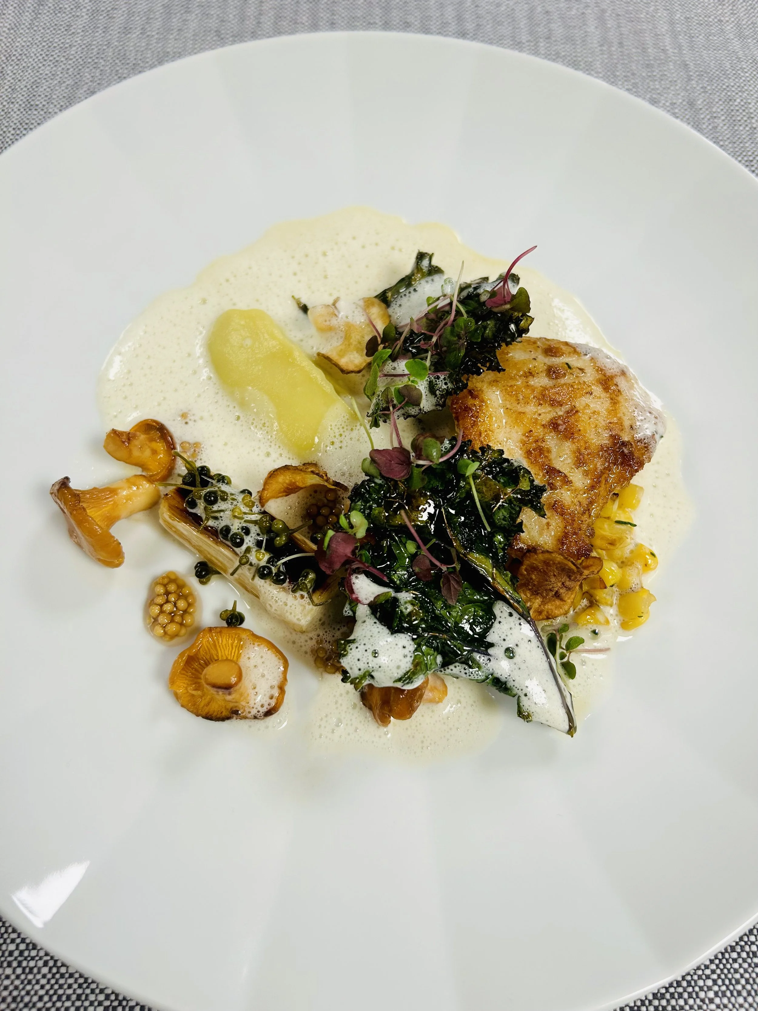 grillede vinterporre - syltede kantareller - friterede skorzonerødder - kørvelolie & torskebisqué tilsmagt med grillet citronsaft