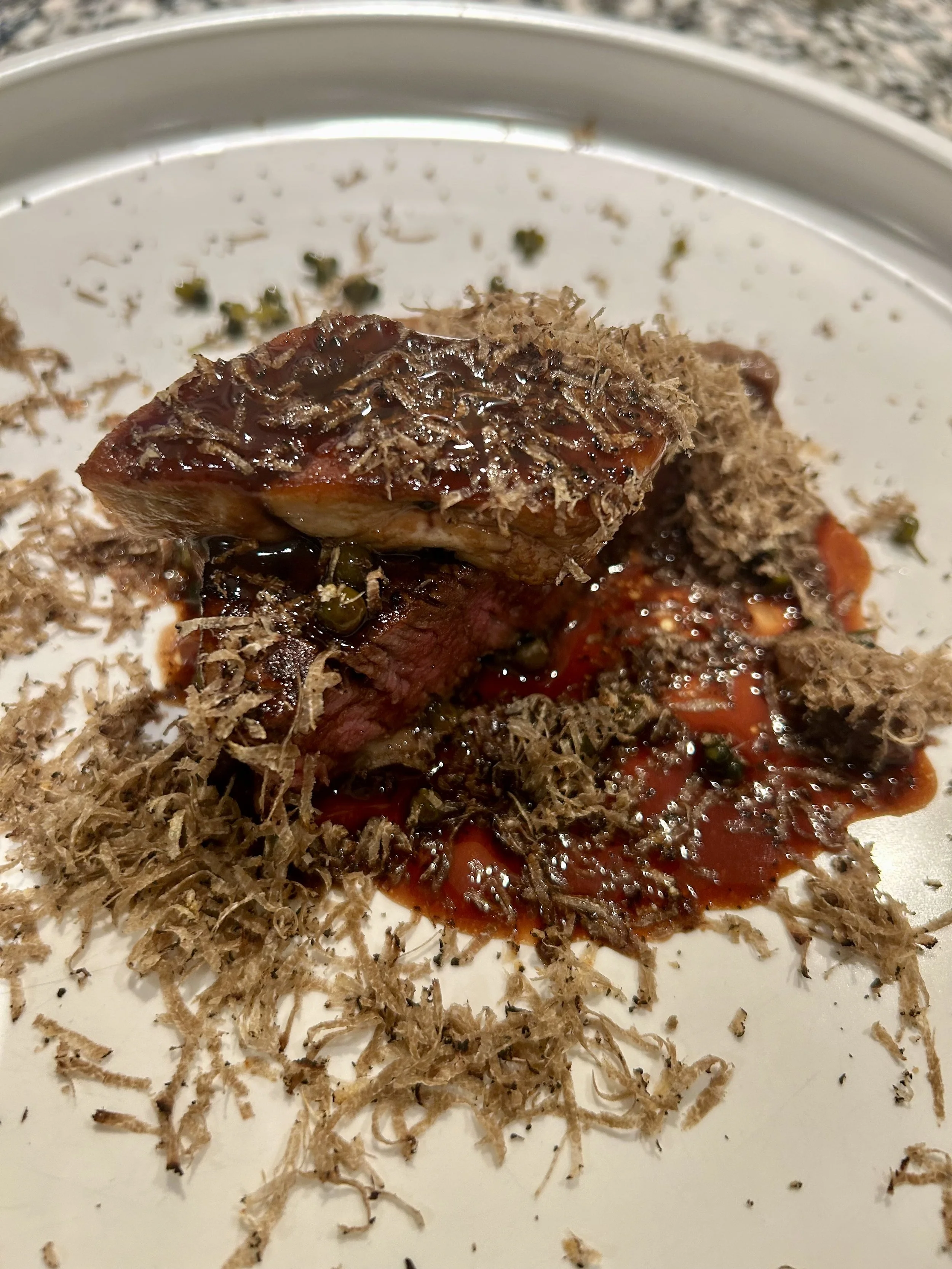 Karl Johan svampe - solbærglaserede rødbede - konfiterede løg - vilde bær & kalveglace med røget marv