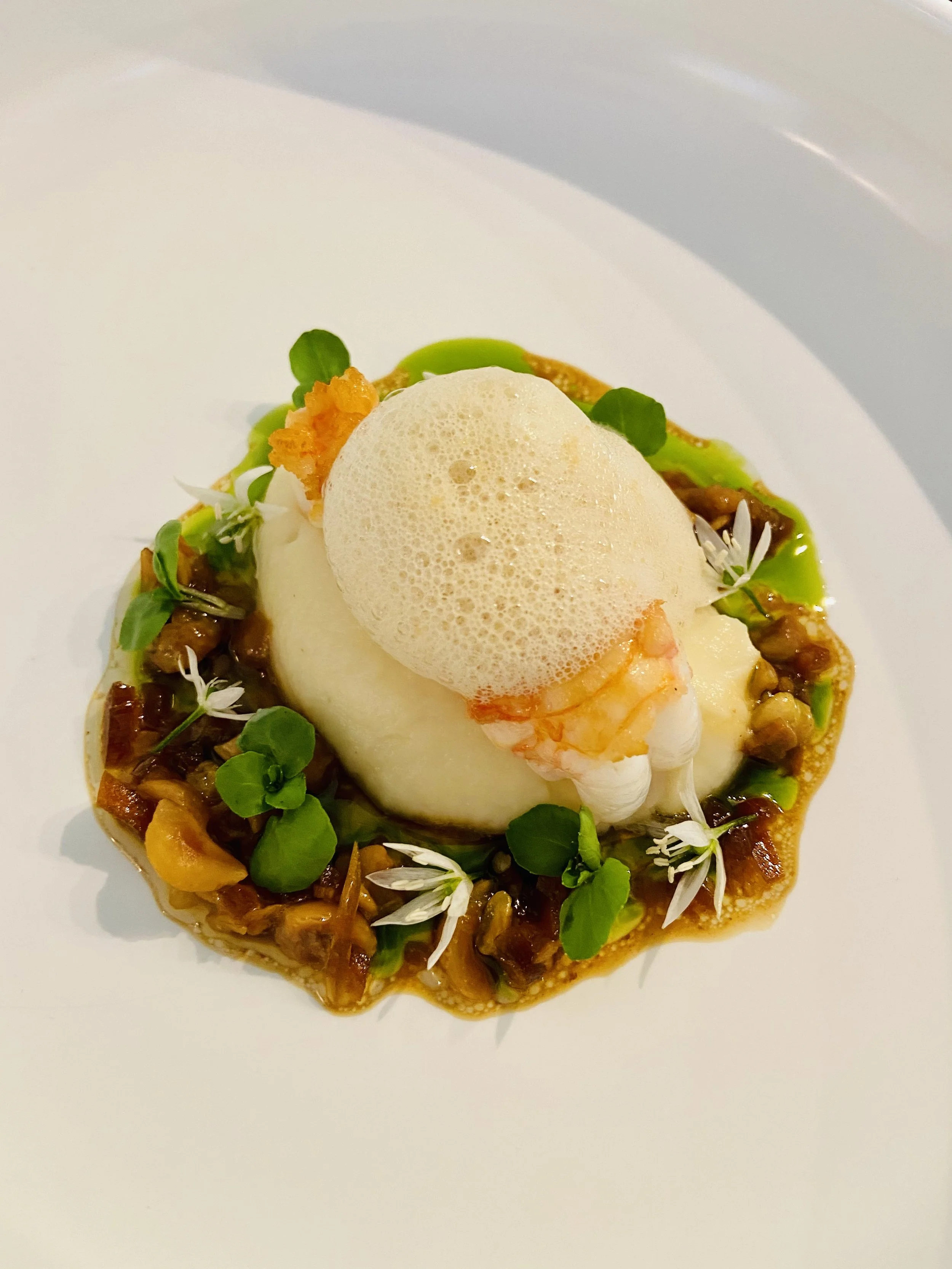 saltbagt selleripuré - spinat - brunet smør med salte græskarkerner - soya - syrlig æble/fennikel salat & flamberet jomfruhummerbisqué